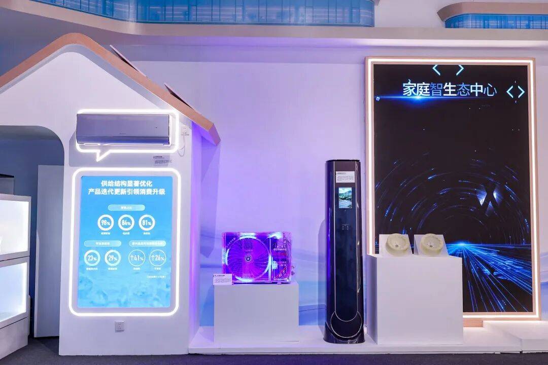 展览现场实物展示了多款格力特色产品,包括作为“全屋智能生态中心”的至尊空调、搭载“AI动态节能科技”的Ai冷静王空调、采用37℃热泵柔烘技术的如新Ⅱ洗护机等。